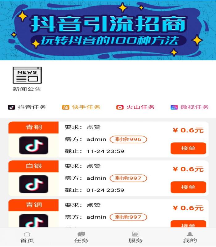 1、全新ui清新主页可接取抖音快手火山微视任务点赞关注 2、任务界面可自动执行任务 ,任务完成之后资源部源码后台审核,即可领取佣金 3、完整的会员制度。(璀璨钻石、钻石、黄金、白银、青铜、)以此类推(后台都可设置任务数量,会员费) 4、个人中心可提取佣金、推广分销、 等等。 5、修复众多BUG 6、无需短信验证即可注册,更方便跨界 7、可封装APP