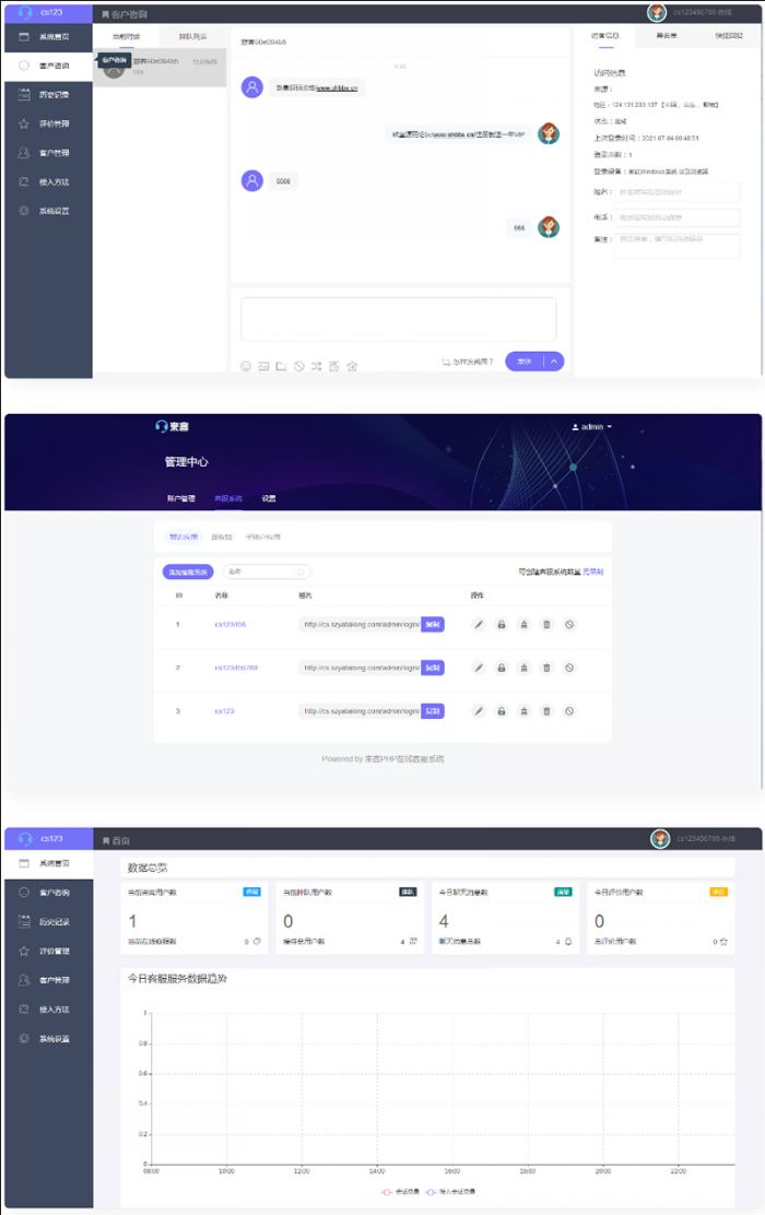 功能比较全,具体的自己去体验吧。 3.6更新:PHP客服系统3.6全开源无限制版 380/3 387.2最新版 1、修复用户端截图发送客服后台收不到问题 2、修复通用设置无法保存问题 3、修复客户管理分组无法添加问题 3.5更新 1、增加删除聊天记录功能(总后台权限) 2、修复子账号删除后依然能登录BUG 3、客服转接功能优化 3.2更新 1、评价功能正式上线,后台可以查看评价、管理评价 2、实时消息优化 3、后台兼容性优化 3.0更新 安装时更详细的权限检查 增加备注昵称功能 移动版常见问题变成按钮 2.8更新 图片预览优化 安全等相关优化 增加客服专属连接功能 2.5更新 支持快捷回复 支持查看访客与其它客服历史消息 支持添加tab页面 2.0更新 支持设置客服常见问题 增加客服转接功能 1.5更新 支持多商家多客服 bug修复及其它优化 1.2更新 修复部分问题及系统优化 1.0更新 客服系统正式发布,本人正在使用中。