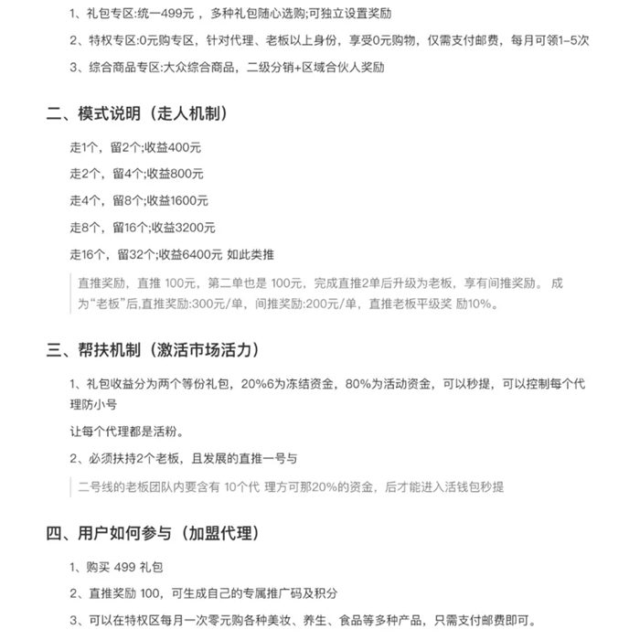 走人留人机制:当用户成为老板后,会把前面推荐的两个人贡献给上级,帮助上级发展团队,自己则独立出去发展团队。当自己的下级成为老板后,也会按照相同方式操作。