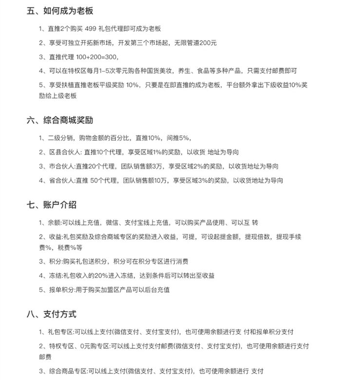帮扶基金机制:成为老板后,用户提成资金的一部分将被冻结,用户只能提现剩余部分。想要获得冻结部分,必须完成两个条件:一是帮助留给上级的两个人成为老板,二是帮助留给上级的两个人团队下面共发展一定数量的订单。